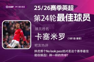 直播吧X咪咕体育|英超第24轮MVP:卡塞米罗!红魔连续4轮蝉联2025-2026赛季英超火热进行中,体育资讯和咪咕体育联合发起每轮英超最佳球员评选活动!第24轮评选结果已经出炉,曼联中场卡塞米罗当选!这也是舍什科、B费、库尼亚之后,曼联球员连续4轮蝉联本奖项。在曼