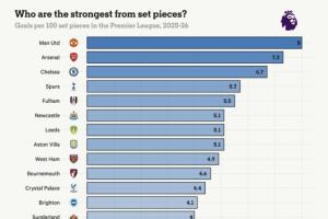 100次机会进8球!TA:曼联是英超定位球效率最高的球队,枪手第二体育资讯02月03日讯据TA报道,本赛季至今,曼联是英超定位球效率最高的球队,每100次定位球机会就能打入8球,高于阿森纳的7.3球。据统计,曼联本赛季英超利用定位球已经打进14球,此数据仅次于阿森纳的