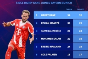 凯恩加盟拜仁后34罚打进32粒点球是同期最多,姆巴佩36罚29中第二体育资讯2月10日讯拜仁在本轮德甲5-1大胜霍芬海姆,凯恩点射梅开二度。德转数据统计显示,凯恩也就此达成了俱乐部+国家队生涯点球100球里程碑,命中率为87%。德转数据统计显示,凯恩自加盟拜仁后打进32